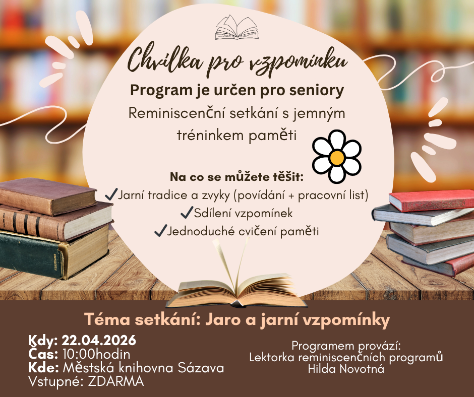 Chvilka pro vzpomínku je komunitní setkání pro seniory, které propojuje vyprávění, sdílení a jemné podněty k vzpomínkám v příjemném prostředí knihovny. Nejde o přednášku ani o "zkoušení". Jde o lidské setkání, kde má každý prostor zapojit se podle chuti – někdo vypráví, někdo poslouchá a postupně se přidá.