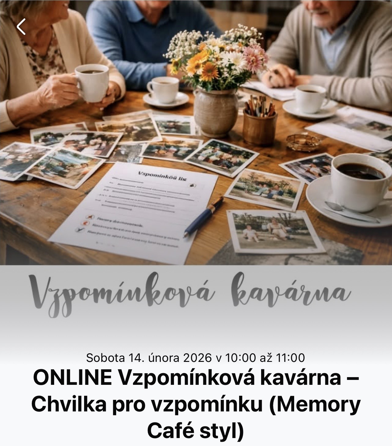 Zveme vás na klidné online setkání v malé skupině, kde si v pohodovém tempu užijete společné chvíle, povídání a vzpomínky. Setkání je po vzoru zahraničních "Memory Café" bez zkoušení a bez tlaku. Kdo chce, povídá. Kdo chce, jen poslouchá. Aktivity jsou vždy dobrovolné.